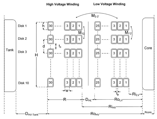 To calculate the parameters of the ladder model, the dimensions of a 33/11 kV 30 MVA power transformer were used, as presented in [9]. The spatial measurements can be found in Table 1, while a detailed cross-sectional view of the transformer winding is shown in Figure 2.