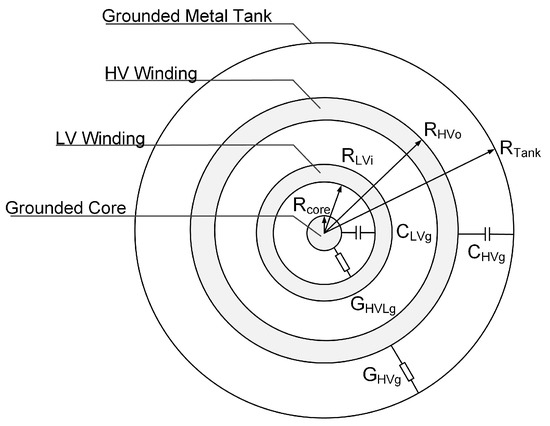 To calculate the ground capacitance, the formula for capacitance between concentric cylinders was used. Referring to Figure 3, the ground capacitance between the HV winding can be calculated using (6), while the ground capacitance between the LV winding and the core can be calculated using (7), considering that the tank and the core are both grounded.