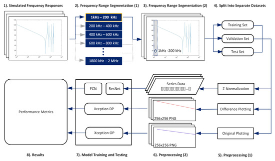 To investigate the performance of the neural networks over different frequency ranges, each frequency response (FR) was divided into 200 kHz intervals, as illustrated in Figure 5. After segmentation, the FRs were split randomly, with 80% used for training, 10% for validation, and 10% for testing. Because the datasets were sufficiently large, this random split resulted in an even class distribution. This study explored both series and image data representations of the FRA data. For the series data, only z-normalization was applied, which is a typical preprocessing step. Two types of image representations were used: Original Plot (OP) and Difference Plot (DP) images. The OPs were a reconstruction of the FRA bode plot with only a single plot on the axes. This type of analysis would be virtually impossible for humans, as there is no baseline plot for comparison on the graph. Neural networks, however, are able to use the axis limits themselves as a frame of reference, and do not need to “see” the reference plot on the same axes. The DPs were produced by plotting both the reference trace and the faulted trace, then shading the difference between them to be closer to what a human expert is able to analyze. The image data had a resolution of 256 × 256 in Portable Network Graphics (PNG) format, as lossless compression was used. The preprocessing and NN training were implemented in Python 3.8 and TensorFlow 2.5.