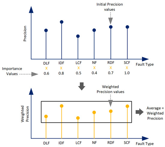 where and are the average weighted Precision and Recall values, N is the number of faults, F is the fault number from Table 4, is the precision of fault F, and is the importance of fault F from Table 4.