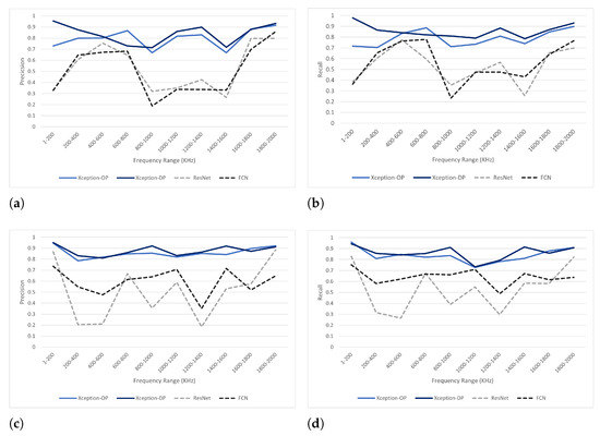 Our results indicate that the neural networks (NNs) trained using images (Xception OP and Xception DP) performed better than those trained using series data (FCN and Resnet) for all frequency response ranges, achieving higher precision and recall values. This aligns with the findings of a previous study [7], which suggested that 2D CNN architectures trained using image-encoded series data outperformed 1D CNN architectures trained using traditional series data. Nonetheless, there may be other factors that influenced this difference in performance.
