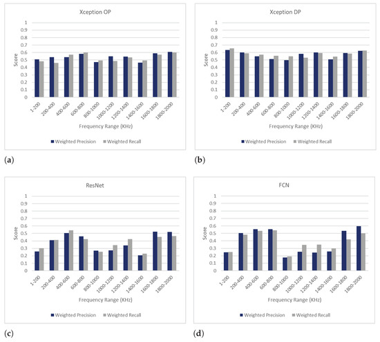Figure 8 displays the results obtained after the application of the weighted importance transformation procedure. In this transformed scenario, Xception-DP continued to have the highest precision and recall values in the 100 kHz–200 kHz and 1.8 MHz–2 MHz regions, while the 400 kHz–600 KHz region produced the best precision and recall scores for both ResNet and FCN. The higher recall value in this region makes it a more practical option. Recall is generally more important than precision in fault classification studies. This is because while a false positive may lead to additional time spent manually double-checking FRs for faults or transformer inspection, a false negative may result in serious damage if left unchecked, compromising the security of the system [28].
