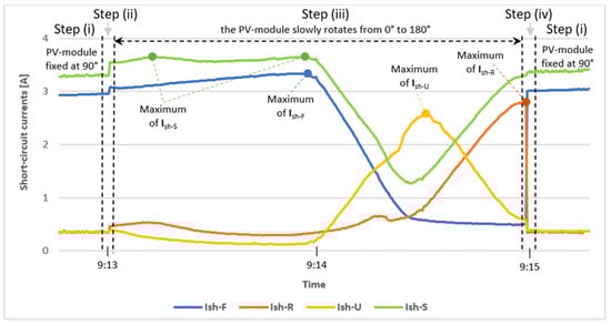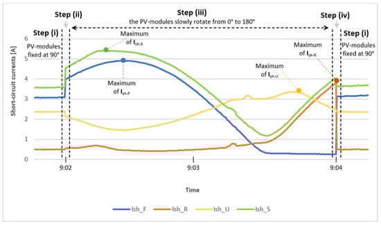 sh-S) is equal to the noteworthy value of about 2.5 amps (46% of its maximum value). During step (iv), the rotating PV modules quickly return to the initial 90° angle position, and they remain there for about two minutes before starting a new rotation sequence.