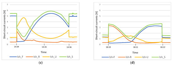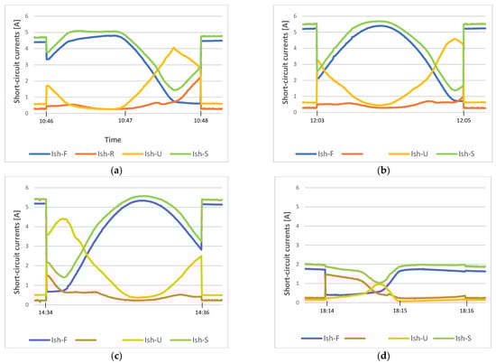 Figure 7 reports four additional excerpts from the daily waveforms of the same aforementioned short-circuit currents; these additional excerpts refer (a) to the late morning, (b) to midday, (c) to the early afternoon, and (d) to the late afternoon. Even if the waveforms are discernably different from those of