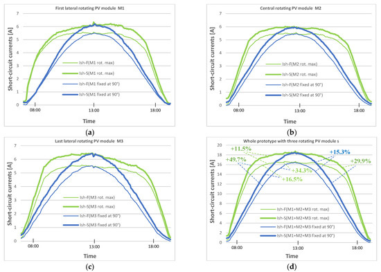 Figure 9d also plots the waveforms of the five short-circuit currents of the same five PV modules of the underlying PV surface (M4, M5, M6, M7, and M8) when all the three rotating bifacial PV modules (M1, M2 and M3) are maintained fixed at the 90° angle position.