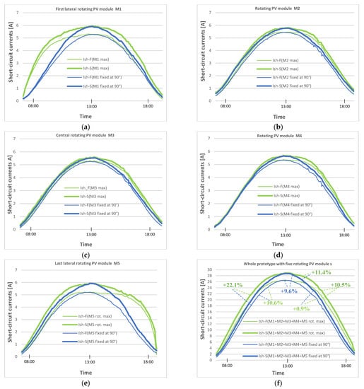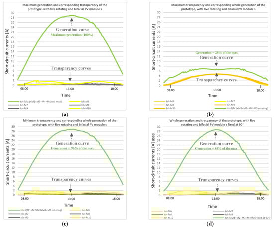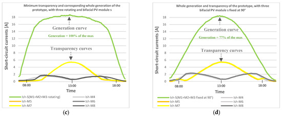 Figure 9c plots the waveforms of the five short-circuit currents of the five PV modules of the underlying PV surface (M4, M5, M6, M7, and M8) when all the three rotating bifacial PV modules (M1, M2, and M3) are rotated to obtain the minimum transparency degree of the PV skylight (that is to say, the maximum shadowing of the underlying surface).