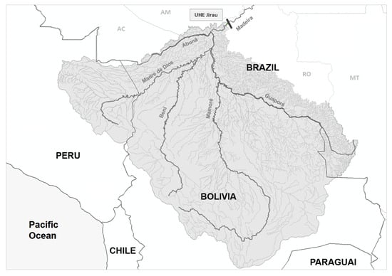 The Jirau HPP is directly affected by sediment-related problems, and the case study presented in this work was carried out in this plant. It is installed in the Madeira River basin, one of the main sub-basins of the Amazon basin, covering an area of over 1.3 million km. Figure 1 presents the hydrography of the Madeira River basin, where it is possible to observe the main tributaries of this basin: the Guaporé, Mamoré, Beni, Abunã and Madre de Dios rivers, with the headwaters located in Brazil, Bolivia and Peru [11,12].