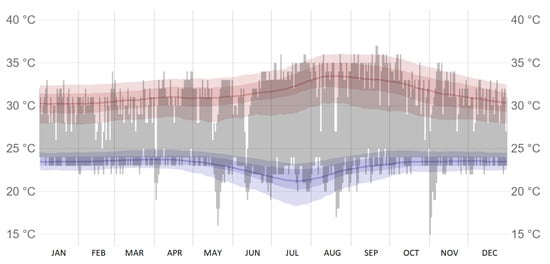 Porto Velho annual temperature history: temperature in the region ranges between 21 and 34 degrees Celsius. Gray bars: daily range of recorded temperatures; red and blue lines: daily highs and lows, respectively.