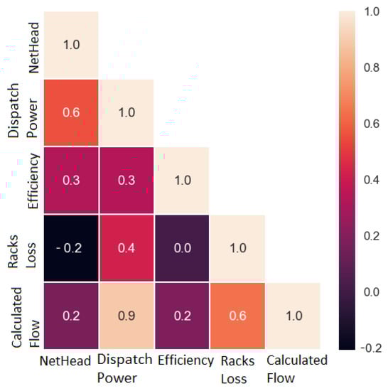 Applying the Pearson correlation formula to the data set, the heat map correlation shown in Figure 6 is obtained. It is possible to visualize a strong correlation between net head and current power and calculated flow and current power and to notice that the relationship between net head and calculated flow is weak. However, the calculated flow strongly correlates with the rack loss.