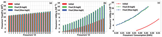(a) Prosumers’ payoff, (b) prosumers’ utility as a function of the prosumers’ ID, and (c) prosumers’ utility as a function of the prosumers’ energy consumption.