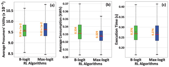 Figure 3a–c demonstrate the average prosumers’ utility (Equation (14)), their average energy consumption, and the execution time of the RL-based DRM model under the B-logit and Max-logit algorithms, respectively. The box plots capture the 0th percentile, i.e., the lowest data point, the 100th percentile, i.e., the highest data point, the 25th percentile, i.e., the lowest part of the box, the 75th percentile, i.e., the highest part of the box, the median value, i.e., the horizontal line inside the box, and the mean value, i.e., the circle point in the box. The results show that the Max-logit DRM algorithm results in higher achieved prosumer utility (Figure 3a) with a relatively lower average consumption for prosumers (Figure 3b) and corresponding shorter execution time (Figure 3c). Thus, the Max-logit DRM algorithm outperforms the B-logit algorithm both in terms of computational efficiency and achieved results for prosumers.