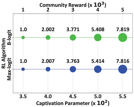 In this section, an analysis of quantifying the impact of the utility company’s provided rewards and the captivation parameter on the communities formation process is performed. Figure 4 presents the average size of the five examined communities in terms of prosumers as a function of the utility company’s allocated rewards per community and the captivation parameter for the B-logit and Max-logit DRM algorithms. The results show that as the allocated rewards and the captivation parameter increase, more prosumers are attracted to join the community, as they have the potential to receive a higher reward (in the form of energy price discount) and have the potential to exchange energy with many more prosumers in the same community. Also, the results clearly show the prosumers’ sensitivity to the provided rewards and captivation parameter, as a small increase in the latter ones drives more prosumers to join the corresponding community. Finally, we observe that the choice of the RL-based DRM model that determines prosumers’ optimal energy consumption does not really affect prosumers’ formation process, given that their resulting energy consumption has small differences that cannot drive prosumers to join a different community.