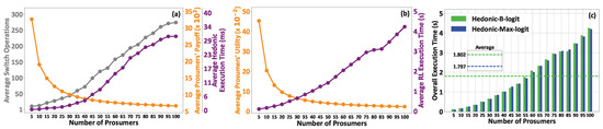 In this section, a scalability analysis is conducted to quantify the efficiency and robustness of the proposed coalitional DRM model. We consider a large smart grid system consisting of up to 100 prosumers who purchase energy from a utility company. All the prosumers are considered as non-self-sufficient, and they purchase energy, while their energy needs are equally distributed in the interval KWh. Figure 5a illustrates the prosumers’ average switching operations, their average payoff, and the hedonic game’s execution time as the number of prosumers increases. Figure 5b presents the average prosumers’ utility and the Max-logit DRM algorithm’s execution time as a function of the number of prosumers. Also, Figure 5c shows the overall execution time of the proposed coalitional DRM model adopting the Max-logit or B-logit RL-based algorithms for an increasing number of prosumers, as well as the corresponding average values over the maximum number of prosumers (N = 100).