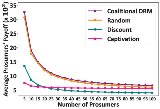 Comparative evaluation: Average prosumers’ payoff as a function of increasing number of prosumers.