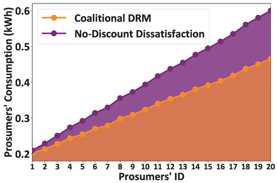 Figure 7 demonstrates the prosumers’ energy consumption as a function of the prosumers’ ID for two comparative scenarios: (i) the proposed coalitional DRM model and (ii) the no-discount dissatisfaction model, where, in the latter one, the prosumers are not sensitive to sharing the communities’ rewards with other prosumers (as captured by the function in Equation (14)). It is noted that in both comparative scenarios, the rewards are shared among the prosumers of the same community following the principles of proportional fairness, as presented in Equation (3). The results reveal that the proposed coalitional DRM model results in lower prosumers’ energy consumption compared with the no-discount dissatisfaction model, as it sophisticatedly captures the impact of the utility company’s allocated reward per community in the prosumers’ decision-making process.