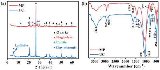 (a) XRD patterns and (b) FTIR spectra of MP and UC.
