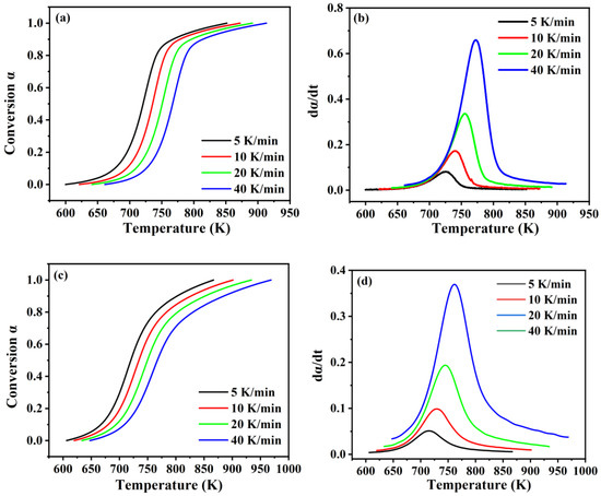 The conversion rates α and reaction rates dα/dt curves of (a,b) MP; (c,d) UC.