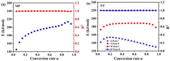 The activation energies E and the corresponding correlation coefficient R2 of the organic matter pyrolysis process by Starink method for (a) MP; (b) UC.
