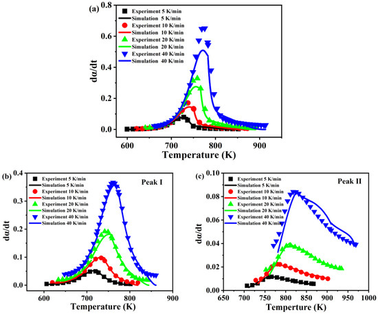 Comparison of the reaction rate dα/dt between the experimental and simulated data for (a) MP; (b) UC-Peak I; (c) UC-Peak II.
