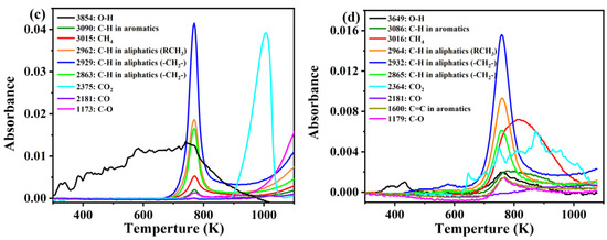 (a,b) Three-dimensional infrared spectra of volatile compounds released during pyrolysis at 20 K min−1; (c,d) the evolution of the major pyrolysis volatiles with temperature increasing ((a,c) for MP and (b,d) for UC).