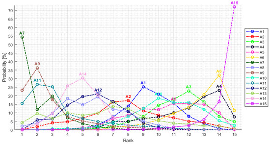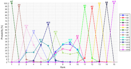 After applying the calculation procedure described in Section 3, the rank acceptability indices were obtained, as shown in Table 6. These results were obtained after 10,000 simulations, which ensures an error of up to 1% at the 95% confidence level [81].