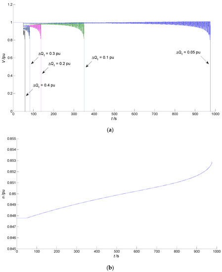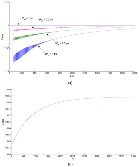 Assume that the system shown in Figure 1 is operating at the SHB point H1, the initial Ppv is 1 pu, and Q1 is maintained at 10.3418 pu. Considering extremely bad weather conditions, such as a total solar eclipse, at time t = 50 s, Ppv suddenly drops from 1 pu to 0 pu, 0.5 pu, and 0.8 pu, respectively. The drop depth dPpv is 1 pu, 0.5 pu, and 0.2 pu, respectively. It can be seen from Figure 5a that the load bus voltage V drops after the disturbance occurs, but an OLTC adjustment can finally recover V to near the target value Vref (1 pu) after a long period of time. As shown in Figure 5b, the drop depth dPpv is 1 pu and it is big enough. When the disturbance occurs, the transformation ratio n continues to increase to raise the load bus voltage and eventually stabilizes at a value of 0.884 pu after a very long time.