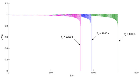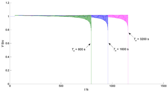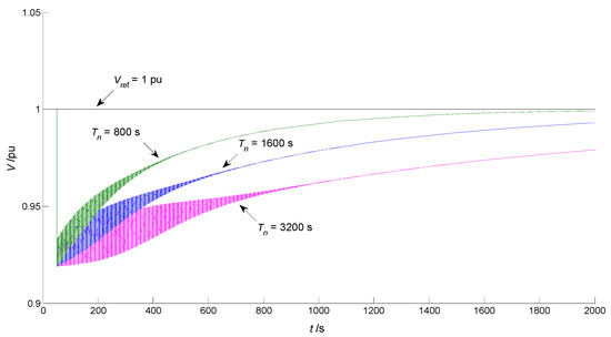 Different time constants Tn can make different impacts on long-term voltage stability when Ppv has a sudden change. In Figure 7, when Ppv drops from 1 pu to 0 pu, a smaller Tn is conducive to the recovery of the voltage V. However, in Figure 8, when Ppv increases from 1 pu to 1.3 pu, a smaller Tn is not conducive to voltage stability.