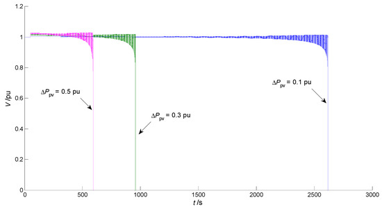 Now assume that the system shown in Figure 1 is operating at the SHB point H1, Ppv increases suddenly from 1 pu to 1.1 pu, 1.3 pu, and 1.5 pu, respectively. The increment ΔPpv is 0.1 pu, 0.3 pu, and 0.5 pu, respectively. It can be seen from Figure 6 that the voltage V collapses after a long period of time. The larger ΔPpv is, the faster V collapses, but the time frame is still in the category of long-term voltage stability.