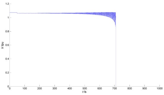 Taking the UHB point H1 as the initial operating point, since it is a subcritical Hopf bifurcation point, a small sudden increase in the reactive load Q1 can cause long-term voltage collapse. As shown in Figure 9, assuming that Ppv is maintained at 1 pu, Q1 increases suddenly from 11.1309 pu to 11.1809 pu at time t = 50 s (namely ΔQ1 = 0.05 pu), and the load bus voltage V collapses at about t = 708 s.