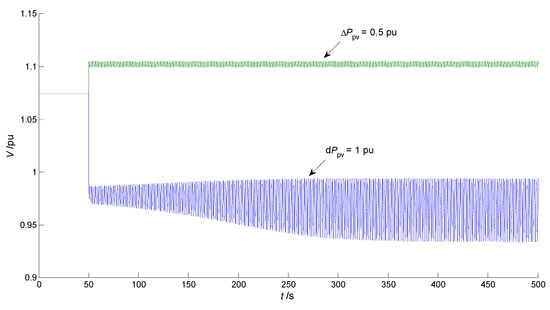 Assume that Q1 remains unchanged (keeping 11.1309 pu), and the impact of the sudden change of Ppv on long-term voltage stability is investigated. As shown in Figure 10, Ppv drops suddenly from 1 pu to 0 pu (namely dPpv = 1 pu) at time t = 50 s. After V drops, the increasing oscillation is carried out firstly and the continuous oscillation (namely the constant-amplitude oscillation) begins at about t = 350 s after the disturbance occurs, and the oscillation amplitude of V is (0.9942 − 0.9344) × 100% = 5.98% > 5%. For the continuous oscillation, if the voltage’s oscillation amplitude is greater than or equal to 5%, it can be considered that the load bus is experiencing long-term voltage oscillation instability.