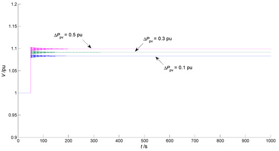 It can be determined by calculation that when Ppv drops suddenly, OLTC can all adjust V to near the target value, and V can be recovered faster under the smaller drop depth dPpv.