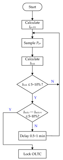 Considering the fluctuation of Ppv, the Ilock index should be calculated and judged twice or even more consecutively, with a delay of 0.5~1 min between the two consecutive calculations and judgments. Once the two (or more) consecutive judgment results are the same, the command of locking OLTC should be issued, and n will be locked at a constant value.