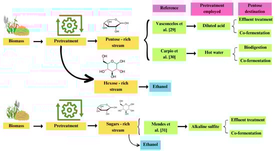 Another primary bottleneck for cellulosic ethanol production is the utilization of different fractions of biomass. Mendes et al. [31], Vasconcelos et al. [29], and Carpio et al. [30] considered various scenarios for the pentose fraction, although there were differences in the scenarios evaluated by each author. Figure 1 illustrates a schematic representation of the pentose fraction’s destiny as considered in these three studies. It is worth noting that the authors employed different pretreatment techniques. Vasconcelos et al. [29] and Carpio et al. [30] used pretreatments that resulted in a liquid fraction rich in pentoses. However, Mendes et al. [31] employed a pretreatment technique that did not solubilize hemicellulose, thereby yielding a solid fraction that still contained significant amounts of hemicellulose, which would be hydrolyzed in subsequent steps.