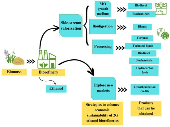 One approach to address the economic challenges of 2G ethanol production is through product diversification within the biorefinery. By valorizing side-streams that contain carbohydrates (hemicellulose) or high-value macromolecules (lignin), additional revenue can be generated, thereby increasing the overall profitability of the biorefinery. Other biofuels and products, such as furfural [33,34], biogas [35], biodiesel [36,37], biochar [38], carotenoids [39], and others, have been reported as alternatives to be produced together with 2G ethanol. In this review, studies that have focused on product diversification to enhance the economic sustainability of 2G ethanol biorefineries are discussed, highlighting those that are utilizing both process simulation studies and a TEA. Currently, there is a gap regarding recent review articles that comprehensively discuss the economic sustainability of second-generation (2G) ethanol biorefineries focused on the context of product portfolio diversification. This kind of discussion is fundamental and can direct efforts and allocation of valuable resources towards potentially promising approaches that may not have been considered due to the absence of consolidated data on this topic. Existing research articles primarily focus on the exploration of one to three bioproducts alongside 2G ethanol production. This review addresses this gap by presenting a comprehensive overview of potentially promising bioproducts that have been the subject of portfolio diversification through a techno-economic assessment. Moreover, the review sheds light on additional products that hold the potential for integration with ethanol production, further emphasizing the significance of this unexplored area in the field of biorefineries.