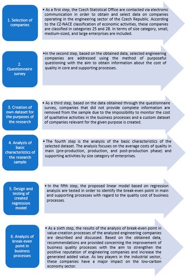 The research was divided into six phases: selection of suitable companies, conduction of the questionnaire survey in the selected companies, creation of own dataset for the purposes of the research, analysis of the basic characteristic of the research sample, design and testing of the created regression model, and analysis of the break-even point of the value-creation processes. A detailed description of the whole process is visualized in Figure 1.