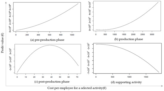 As seen in Table 2 and Table 3, in the third step, the quadratic dependence of profitability on individual costs is presented. All other costs were always set to the average value in the charts given in Figure 4a–d. In the charts, the X-axis shows the cost per employee and the respective activity, with the domain of the chart set to cover all available data. The Y-axis shows the predicted value of profit for given costs and activity and the average cost for other activities.