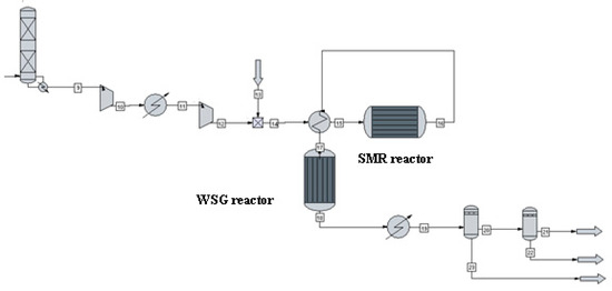 Figure 2 shows a process flow diagram of biomethane to hydrogen conversion. The steam and methane flows to the mixer, and mixture then flows to the methane steam reformer reactor, where the products and substrates are heated. The syngas next enters the water–gas shift reactor. Methane steam reforming is carried out at the high temperature of 900 °C and a pressure of 3 MPa on an Ni catalyst with Al2O3 support. Biomethane is mixed with steam in the ratio of 2,3,4:1, and the heat of the reaction products is used to heat the dosed substrates. An amount of 30% excess air is used in the steam generator. The water–gas reactor operates at a temperature of 350 °C and a pressure of 2–3 MPa. A kinetic reactor is used, in which the individual kinetic data of the reactor have been taken from reference [8].