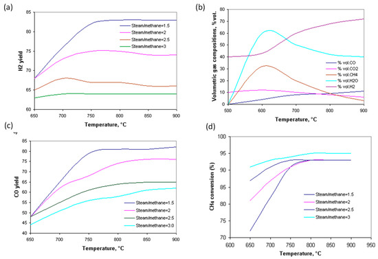 H2 yield dependent on temperature and steam/methane ratio (a); volumetric gas composition dependent on temperature, %vol. (b); CO yield dependent on temperature and steam/methane ratio (c); CH4 conversion dependent on temperature and steam/methane ratio (d).