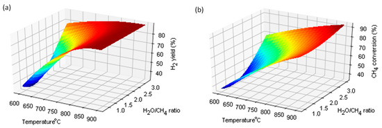 The equilibrium calculation was also presented by Braga and Silveira [21], whose work was in agreement with the presented calculations. Figure 4a shows the effect of temperature and H2O/CH4 ratio on the H2 yield. In the figure, it can be seen that with the increase in the temperature and the H2O/CH4 ratio, the efficiency of the produced hydrogen increases. The use of an appropriately large excess of steam and temperature gives the effect of intensifying the reaction. Figure 4b shows the effect of temperature and H2O/CH4 ratio on the methane conversion rate. The influence of these factors intensifies the CH4 conversion reaction. In turn, the efficiency of CO production increases with increasing temperature, but decreases with increasing H2O/CH4 ratio. As the methane conversion rate increases with temperature, the equilibrium composition of the gas also changes, with an increased efficiency in regards to hydrogen and carbon monoxide. In industrial plants, the catalytic conversion of methane with steam is carried out at a temperature of 900 °C and a pressure of 3 MPa. While the increased pressure adversely affects the position of the equilibrium states, it is used for economic reasons.