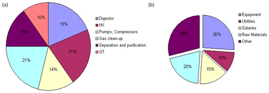 Figure 5a shows the distribution of CAPEX costs for the operation of units used in the chemical process. The digester, steam reformer, and WSG reactor are the main contributors to equipment investment costs. The percentage of operation and maintenance costs is shown in Figure 5b. These cost values are comparable to those found in the literature [19,20].
