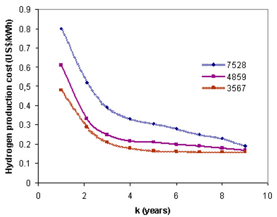 where: —hydrogen production costs (US$/kWh), —profitability ratio (1/years), —investment costs in hydrogen production equipment, —equivalent installation lifetime (h/year), —hydrogen flow rate, kg/s; and —maintenance and operating costs (US$/kWh).