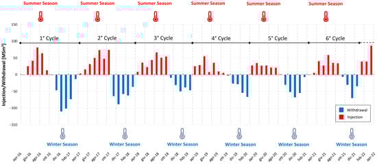 Typical cycles of injection (red) and withdrawal (blue) of underground gas storage activity. Data from Uelsen, Germany [4]).