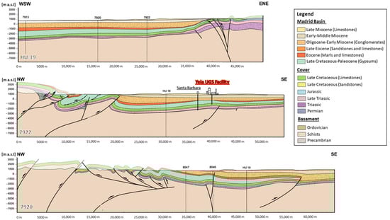 De Vincente et al. [19] designed geological cross-sections from seismic reflection profiles of the southern boundary of the Central System and the Iberian Chain, which can recognise a complex thick-skinned thrust system developed during the Cenozoic [19]. Figure 3 shows the easternmost cross-sections of the Madrid Basin.
