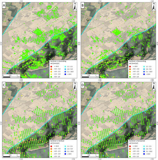 Displacement velocity rates calculated using (A) ascending, (B) descending, (C) vertical, and (D) Horizontal Sentinel-1 data collected from January 2015 to December 2021. The grey polygon, elongated in a NE–SW direction, depicts the deep structural trap where natural gas is stored. The dotted polygon represents the Yela facility.