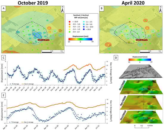 Vertical ground displacement maps of Yela facility constructed using IDW interpolation of motion data, referring to (A) the period of maximum injection in 2019 (October) and (B) the period of maximum extraction in 2020 (April). (C) Average time series analysis of selected MP (polygon with blue dashed border in (A,B)) compared with the curve of gas in storage (at the top). (D) 3D analysis of ground displacement occurring in the maximum (October 2019–2020) and minimum (April 2020) peaks at the end of each injection and withdrawal period. (E) Focus on average time series in the years with data matching the curve of gas in storage (at the top).