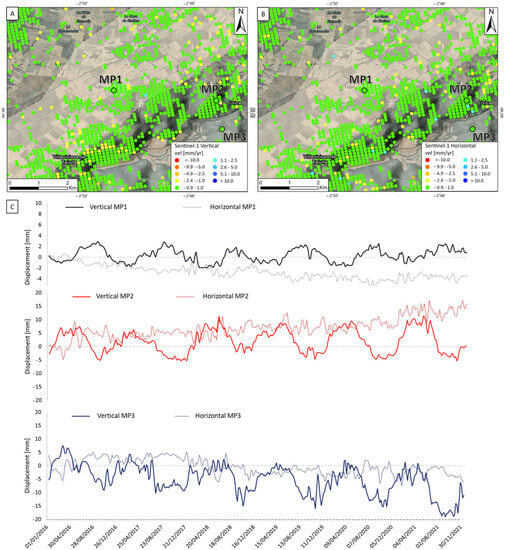 Vertical (A) and horizontal (B) displacement velocity rates. At the bottom is the time series comparison between vertical and horizontal displacements (C) of three MPs (MP1, MP2, and MP3) in the study area. The grey polygon, elongated in a NE–SW direction, depicts the deep structural trap where natural gas is stored.