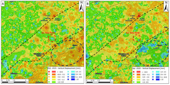Vertical ground displacement maps constructed using IDW interpolation of motion data from (A) the period of maximum injection in 2019 (October) and (B) the period of maximum extraction in 2020 (April). The black dotted lines represent the boundary of the structural trap at a depth at which natural gas is stored. The red dashed circle represents the Yela field area, and the blue dashed circle represents the external area (A2) with different and opposite behaviour.