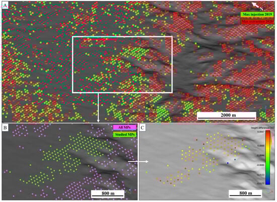 Analysis of volumetric changes using CC. In (A), an extended view of all the MPs relative to the period of maximum injection in October 2019 (Red) and the period of maximum extraction in April 2020 are shown together. It is evident that inside the white square (Yela UGS site), the green dots are higher than the red ones. In (B), the green dots represent the MPs used for CC volume computation, and in (C), the height differences between the maximum injection in 2019 and the maximum extraction in 2020, assigned to each 125 × 125 m2 grid centres (represented by the coloured dots), are shown.