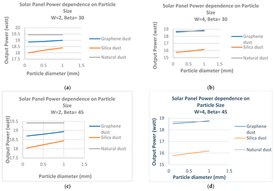 The effect of three different dust types (graphene, silica, and natural dust) on the output power of PV panels was investigated. The investigations extend over many environmental conditions. The environmental factors that have been studied are wind velocity, particle size, and PV panel tilt angle. The effect of the dust particle size on the output power of the PV panel is presented in Figure 6a–f.