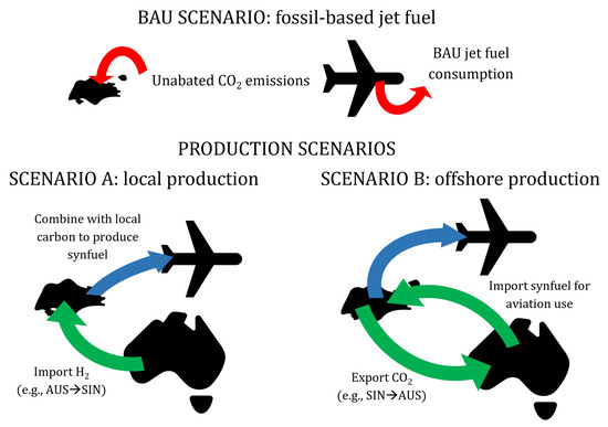 To determine the possibility of using synfuels as a utilization option for Singapore, we consider one baseline scenario and two production scenarios. First, we consider a baseline or business-as-usual (BAU) scenario wherein synfuel production is not considered at all. Singapore is one of the largest oil trading and refining hubs not just in Asia but in the world [26], with an average refinery throughput of one million barrels per day in 2019 [27]. The country houses a complex infrastructure of refineries and trading centers bolstered by cutting-edge technology, making it a cost-effective location for the petrochemical industry. In the BAU scenario, we consider fossil-based fuel production to continue as-is, while the aviation sector continues to use fossil-based jet fuel. Next, we consider two synfuel production scenarios: local synfuel production with hydrogen imports (Scenario A) and offshore synfuel production with exports (Scenario B). In Scenario A, we look into the possibility of producing synfuel locally, wherein the production plant is located in Singapore with feedstock sourced from local industry emissions (e.g., refineries) and hydrogen feedstock is imported from a country with significant renewable energy capacity (e.g., Australia). In Scenario B, we locate the production plant offshore and look at exporting the local feedstock and importing the finished synfuel product back to Singapore. Figure 1 illustrates the three scenarios. We look at the economic feasibility of each scenario by considering a range of values for the specified parameters as found in the literature. We then compare the three scenarios with each other to determine the conditions under which one scenario may be favored over the others.